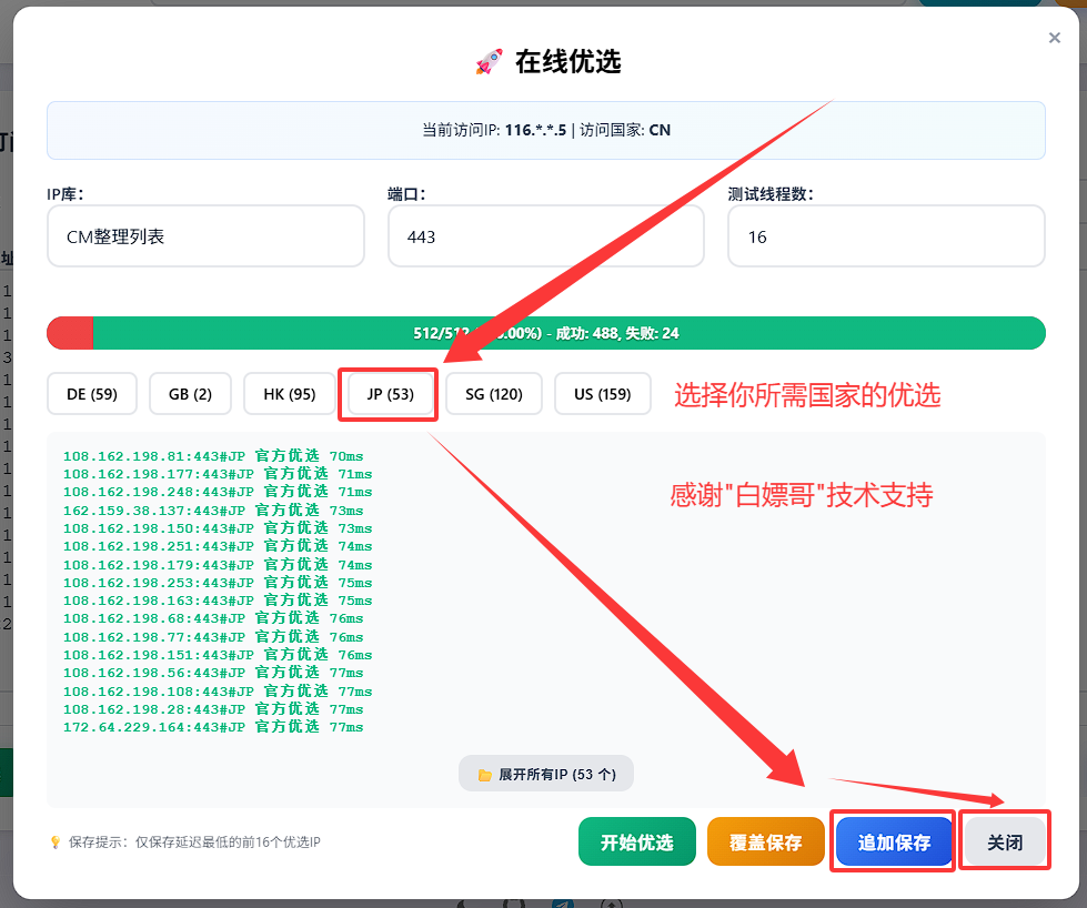 在线优选按钮,注意必须关闭代理并且使用国内网络直连,才能进行在线优选!- IP库:默认为